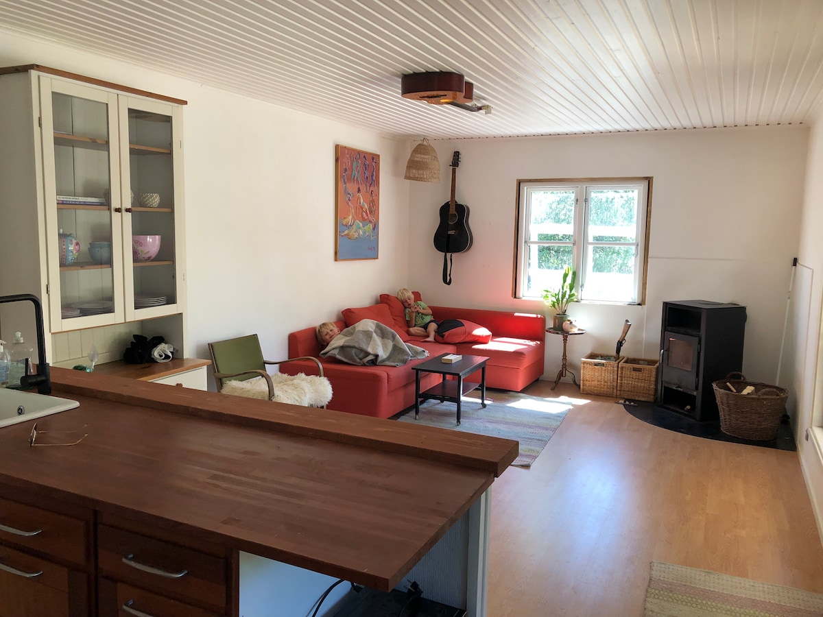 The caravan is cozy and retro, and it has a kitchen, fridge and a toilet. You can use our shower in the house if you like. There are two double beds, they are quite comfy. 😊 The caravan is situated in our driveway, with flowers outside and a cozy area with a table and chairs where you can eat, if you want to do that outside. (See photos). Inside there are lots of space to eat, too (two sitting groups).