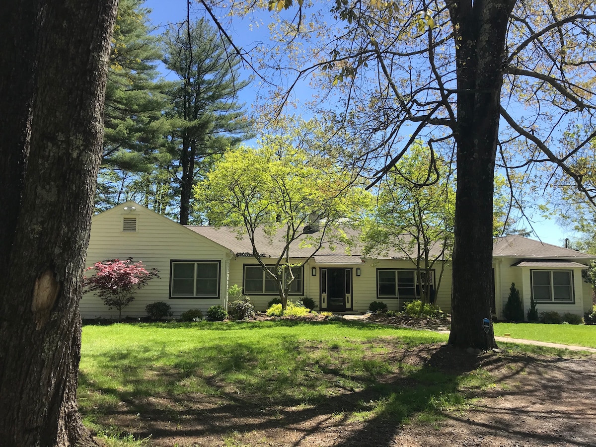 PRIVÁT modern/rusztikus lakás GYALOG A VÁROSBA 5 * „PREMIER” értékelés NINCS TOVÁBBI DÍJ! 1000 négyzetláb Háziállatbarát n/c Park Master King Suite &I can put up 2cots /crib Teljes konyha Cathedral Living Room w/Mountainview. 1,5 fürdőszoba Terasz kültéri étkezéshez hegyi kilátással TŰZRAKÓ A TERASZON Wi-Fi Mosás/szárítógép Gázgrill Lépésnyire a Town Green és NYC buszmegállótól, THE COLONY, Yum Yum, Goodnight, Garden Cafe, Silvias, Bread Alone, Mud Club, Station Bar, üzletek. Temető Bubbling Stream, Privát játszótér