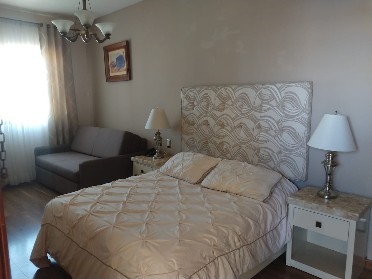 La suite esta equipada para brindar el mayor confort. Descanse en su cama con colchón memory foam mientras ve una película en la smart TV, WIFI alta velocidad. Disfrute de un buen baño en una regadera con acabados de alta calidad. Prepare comidas en la cocina totalmente equipada. Trabaje sin preocupaciones en el escritorio contamos con wifi de alta velocidad.