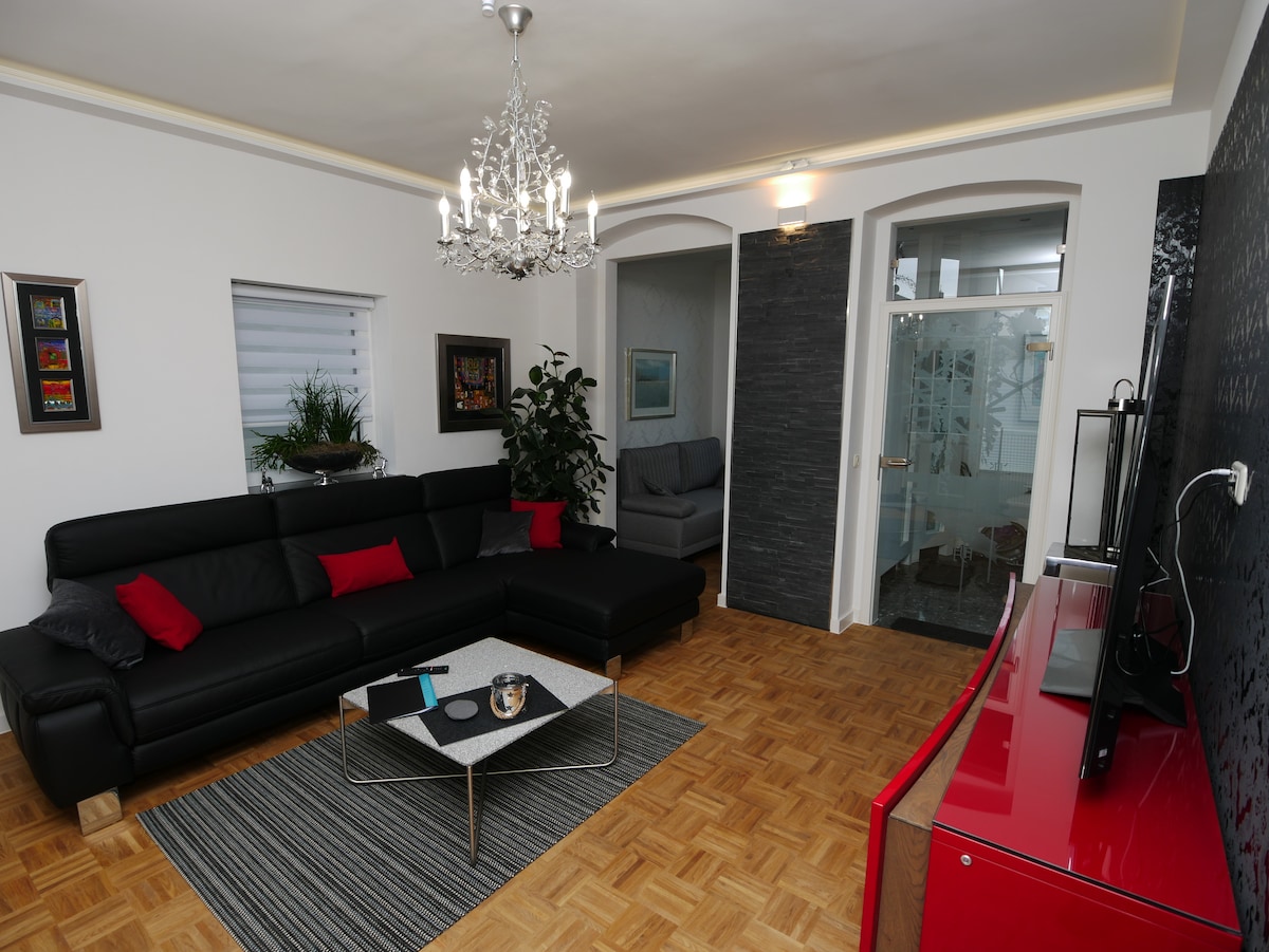Moin in the apartment togetherness. Itt adhatod meg a maximumot. Két ember 41 négyzetméteren, lazíts stílusos és otthonos légkörben. Reggelente a teraszon vagy a teljesen felszerelt konyha-nappaliban fogyaszthatja el a reggelit, este pedig a grillezőn élvezheti a grillezést. Piszkos időben helyezd magad kényelembe az 50hüvelykes Smart TV előtti kanapén, vagy olvasd el a kedvenc könyvedet a hintaszékben. A king-size rugós ágyon pihenhetsz, és másnap felfrissülve kezdheted a napot. Mosodai csomaggal