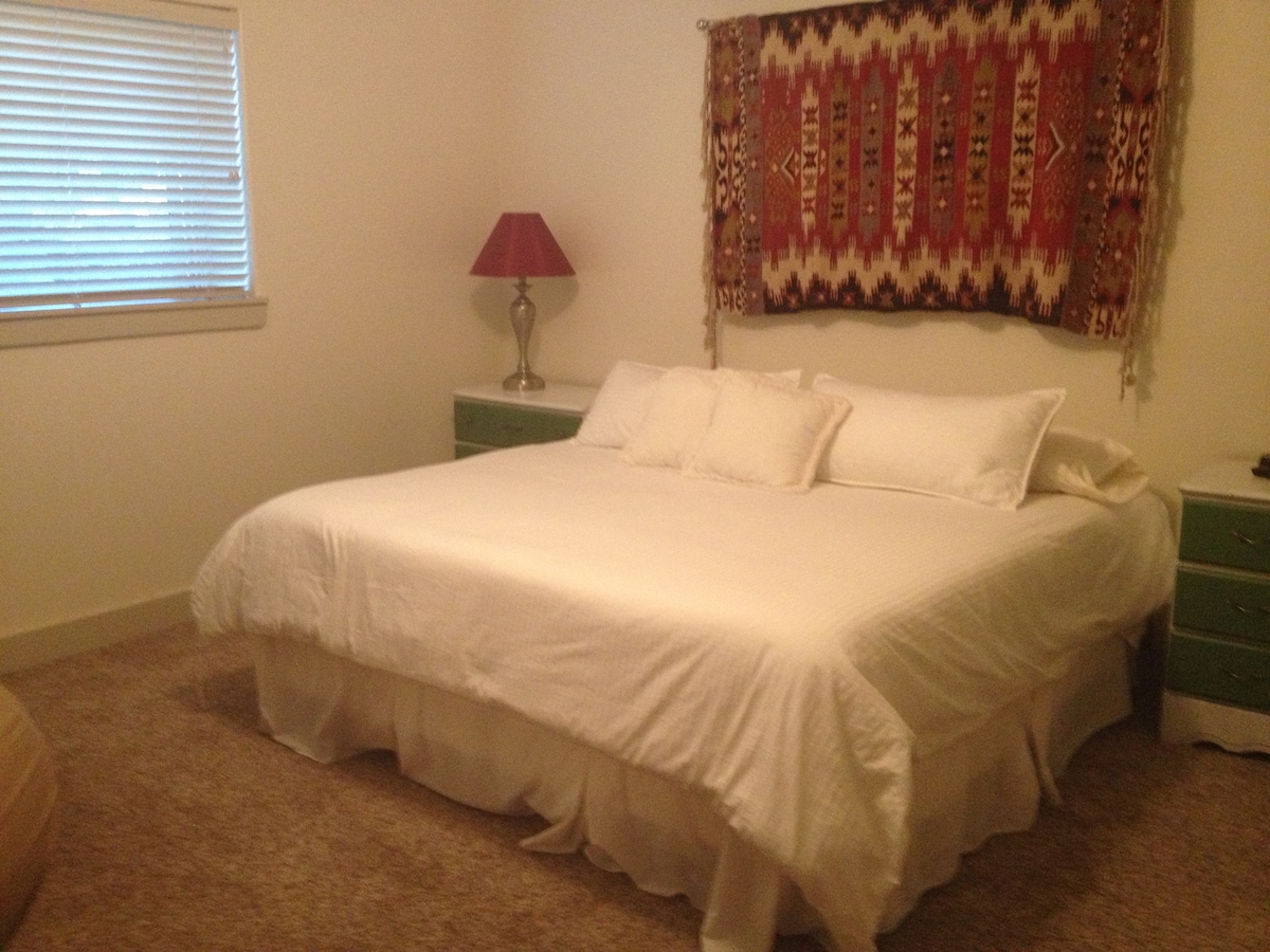 Ez a foglalás elképesztő! Tetszeni fog! Ez az emeleti szoba egy lakosztály! Van egy franciaágy, 6 láb kerti kád és külön zuhanyzó. Télen helyiségfűtő berendezéssel, valamint kis munkaasztallal és székkel rendelkezik. Saját mosógéppel, szárítóval és mini hűtővel rendelkezik, kis asztallal és két székkel a Walk-in-Closet-ben. A reggeli egyszerű és kényelmes, gabonapehely, kenyér, gyümölcs, mandulatej, joghurt, krémsajt. Csak ott van, ha kell. A hátsó udvarban is van egy kellemes piknikezőhely.