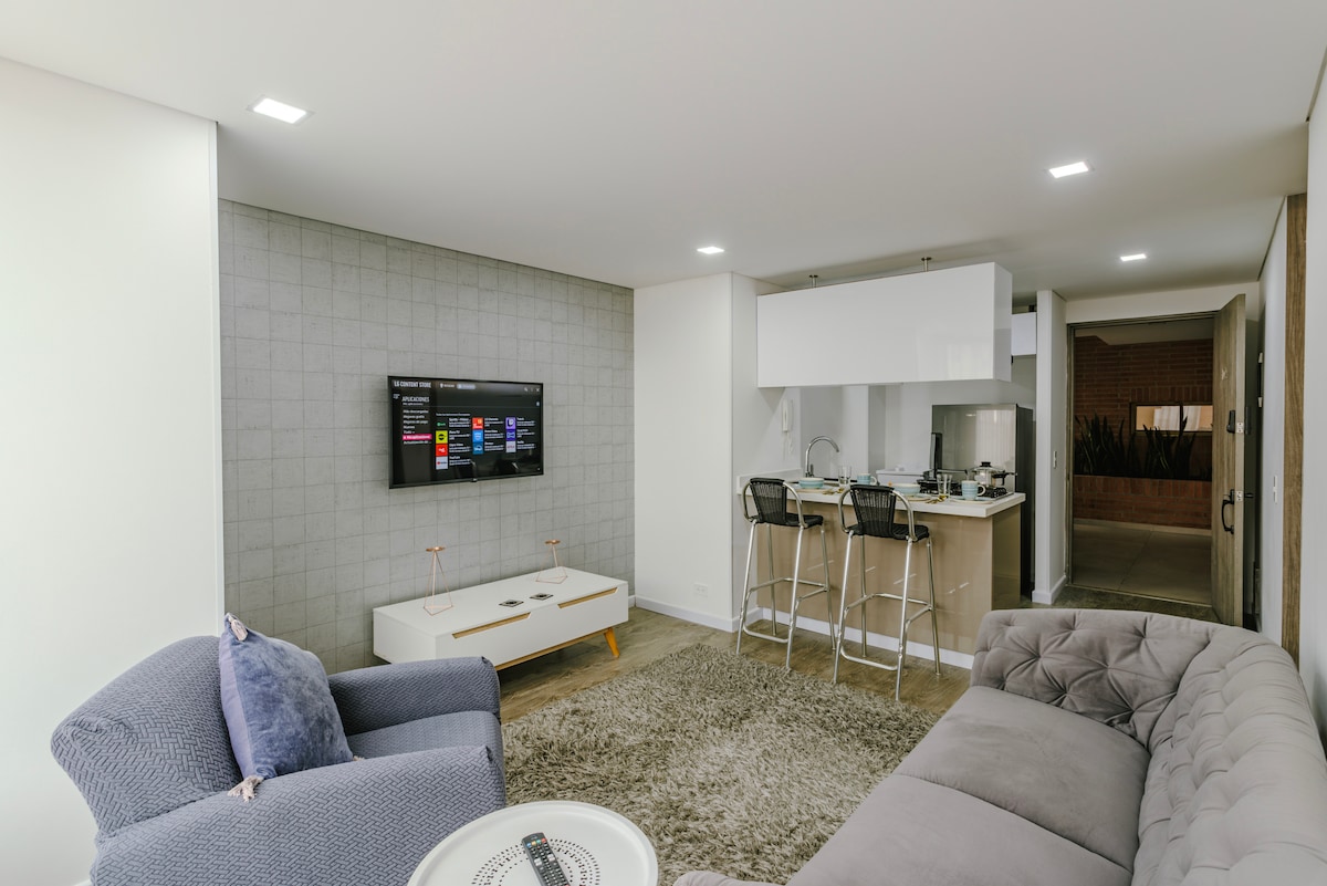 Modern új apartman Chia-ban, ideális munkához vagy pihenéshez. Kétszemélyes ággyal, kanapéággyal, felszerelt konyhával, funkcionális fürdőszobával, mosóhellyel, lámpás íróasztallal, okostévével és hangprojektorral rendelkezik. Szép kilátás, kiváló minőségű felületek, gyors Wi-Fi és kiváló természetes megvilágítás. Nagyon közel a La Sabana Egyetemhez, a Centro Chía-hoz és Fontanarhoz. Hozzáférés a kerthez, a teraszhoz, a társalgóhoz és a tömegközlekedéshez. Ideális rövid vagy hosszú távú foglalásokhoz, mindennel, amire szükséged van!