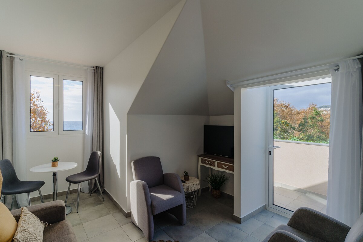 Ez az apartman 103 négyzetméter található a második emeleten, és két emeletre oszlik. Az alsó emeleten van egy hálószoba queen-size ággyal, egy tágas fürdőszoba zuhanyzóval és francia erkéllyel. A felső emeleten van egy nagy nappali kanapéval (kapacitása 2 vendég) teljesen felszerelt konyha, mosoda, fürdőszoba zuhanyzóval és egy hangulatos erkély, ahol lehet enni.