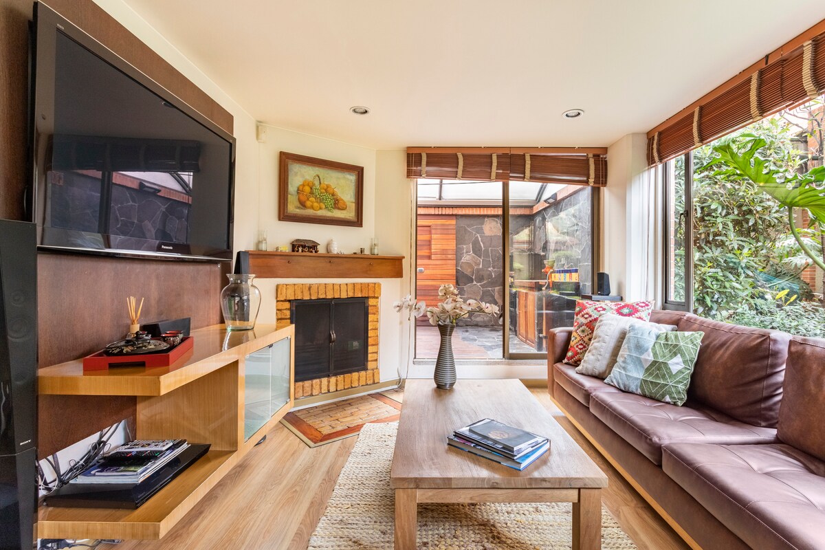 Este apartamento es ideal para quienes buscan confort, tranquilidad y ubicación estratégica en Bogotá. Cuenta con dos habitaciones, la principal con una amplia cama king y baño privado. La segunda habitación cuenta con cama doble. La sala ofrece un espacio cómodo y cálido para relajarse; tienes disponible chimenea y televisión para disfrutar momentos acogedores. Su cocina es amplia y completamente equipada es perfecta para cocinar como en casa, acompañada de un comedor para seis personas.
