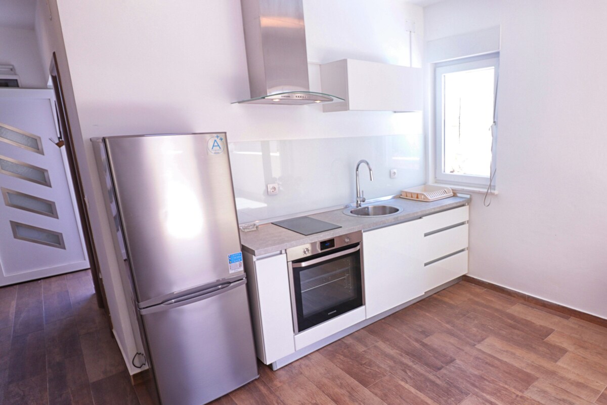 Modern luxusvilla úszómedencével és tengerre néző kilátással. A villa 5 modern, bútorozott apartmannal rendelkezik 6 fő részére, tágas terasszal és gyönyörű kilátással a tengerre. Az apartman ingyenes Wi-Fi-vel, légkondicionálóval és parkolóval rendelkezik. A kertben szép medence található (más vendégekkel megosztva), ahol a vendégek nyugodtan pihenhetnek a nap folyamán. Villa található, mindössze néhány perc sétára a strandtól, és nem messze a városközponttól. Élelmiszerbolt és buszmegálló közvetlenül a Zrce strand mellett található.